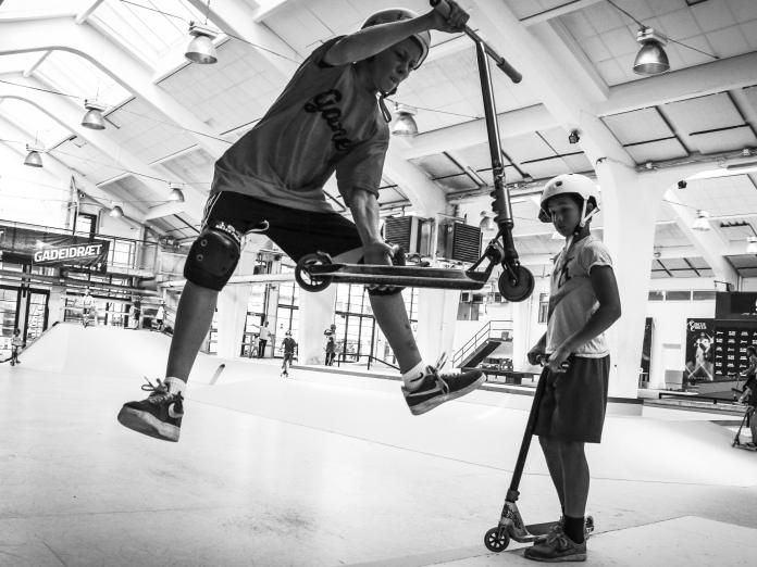 Scoot handler om fart, balance og fede tricks. Man kører, hopper og glider hen over ramper og kanter. Lyden af hjul på asfalt fylder luften med